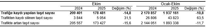 Ekim ayında trafiğe kaydı yapılan taşıt sayısı bir evvelki aya nazaran kamyonette %18,3, arabada %9,0, kamyonda %7,1, traktörde %3,9 artarken minibüste %44,2, motosiklette %30,8, otobüste %19,0 ve özel hedefli taşıtta %12,0 azaldı.