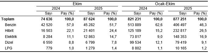 Trafiğe kaydı yapılan arabaların yakıt cinslerine nazaran dağılımı, Ekim 2025