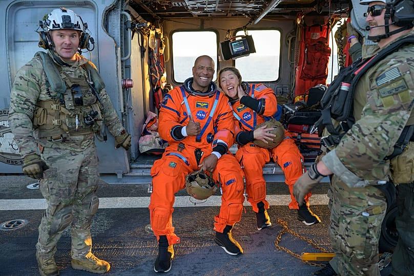 In a scene reminiscent of NASA’s Apollo moonshots of yesteryear, military helicopters hoisted the astronauts one by one from an inflatable raft docked to the capsule, hauling them aboard for the short trip to the Navy’s awaiting recovery ship, the USS John P. Murtha.