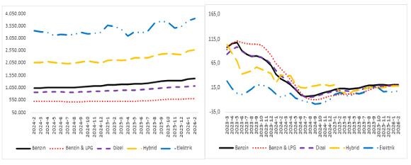 Şubat ayı datalarına nazaran yakıt cinsine nazaran ortalama araba fiyatları incelendiğinde akaryakıtlı araçlarda ortalama fiyat 1 milyon 418 bin TL, akaryakıt & LPG’li araçlarda 605 bin 450 TL, dizel araçlarda 1 milyon 117 bin TL, hibrit araçlarda 2 milyon 580 bin TL ve elektrikli araçlarda 3 milyon 833 bin TL olarak gerçekleşti. Yıllık değişim oranlarına bakıldığında ise akaryakıtlı araçlarda yüzde 20,7, akaryakıt & LPG’li araçlarda yüzde 19,2, dizel araçlarda yüzde 18,7, hibrit araçlarda yüzde 18,9 ve elektrikli araçlarda yüzde 9,1 artış görüldü.