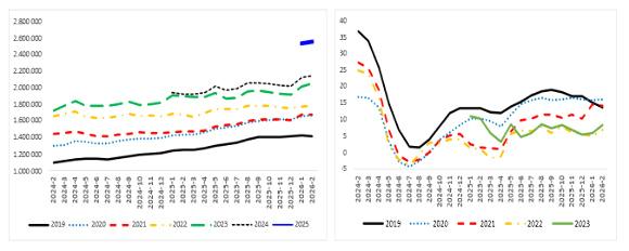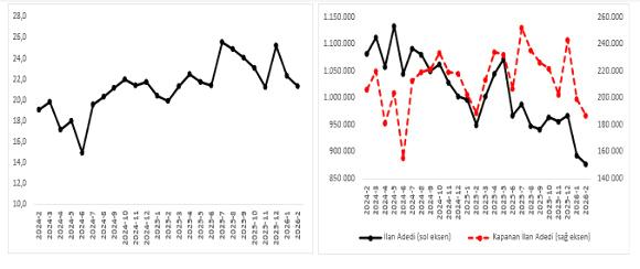 Şekil 5: Satılan araba sayısının satılık araba ilan sayısına oranı (%) (Sol panel), satılan ve satılık araba sayısı (Sağ panel)