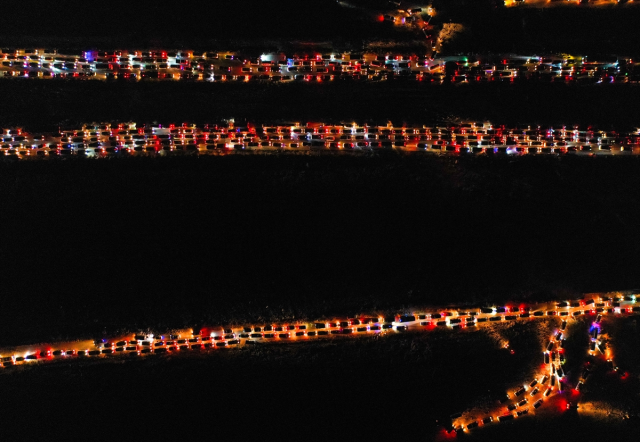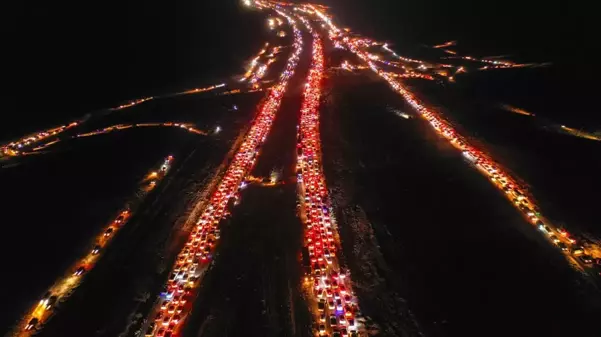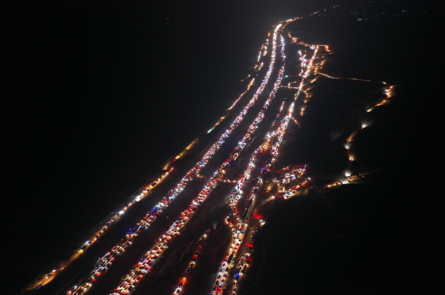 Suriye‘de Beşşar Esed rejiminin kontrolü kaybettiği başkent Şam’a doğru yola çıkan Suriyeliler, kent çevresinde yoğun araç trafiğine neden oldu. Yollarda oluşan uzun araç kuyruğunun dron ile görüntülendi. Yola sığmayan araçların toprak alandan ilerleye çalıştığı görüldü.