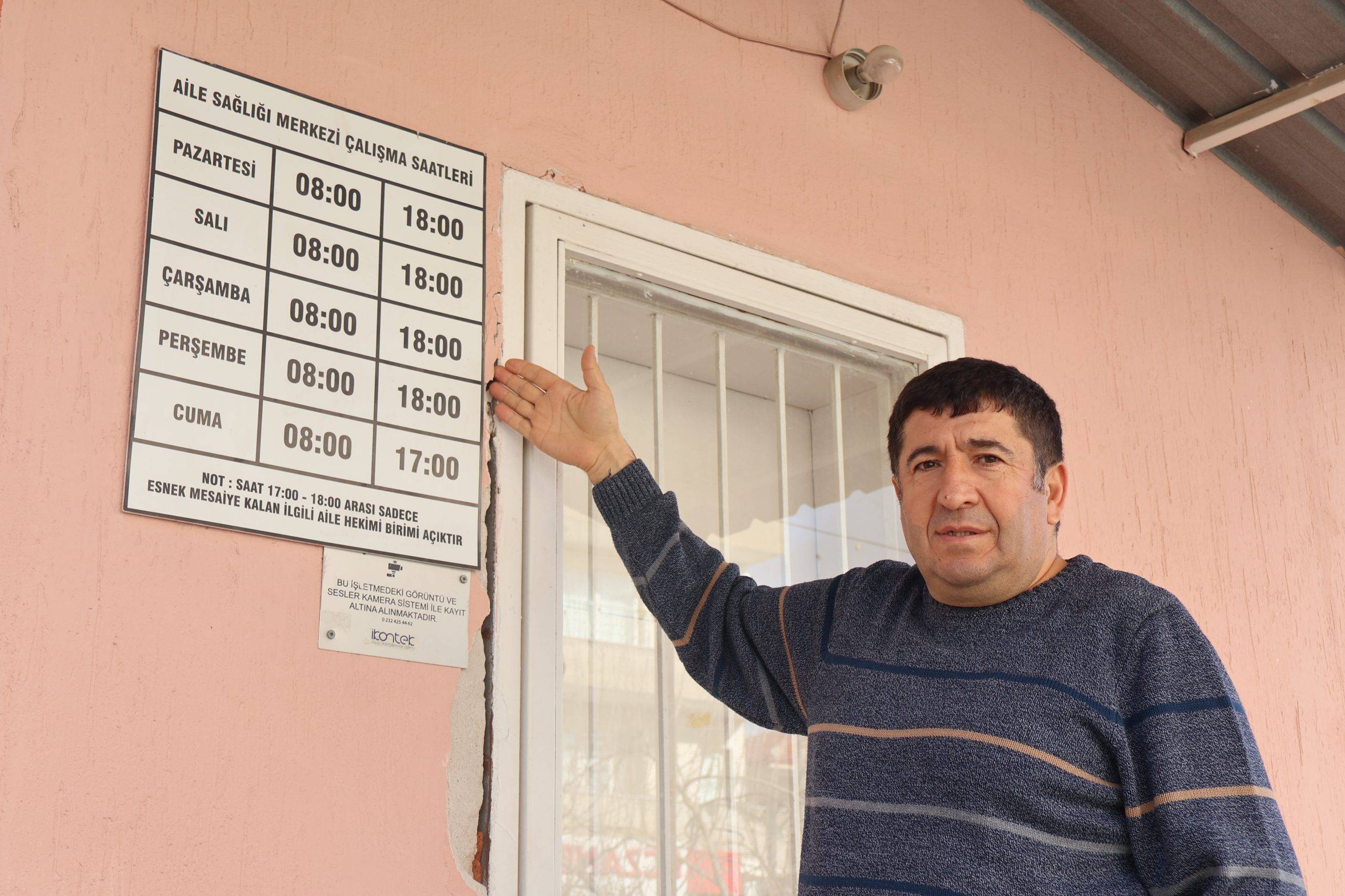 Dayanılmaz ağrıları nedeniyle Sarnıç’taki Sağlık Ocağı’na giden Aktaş, Sağlık Ocağı’nın haftasonu ve hafta içi gece kapalı olmasına tepki gösterdi. Aktaş, mesai saatlerini de eliyle işaret ederek gösterdi.