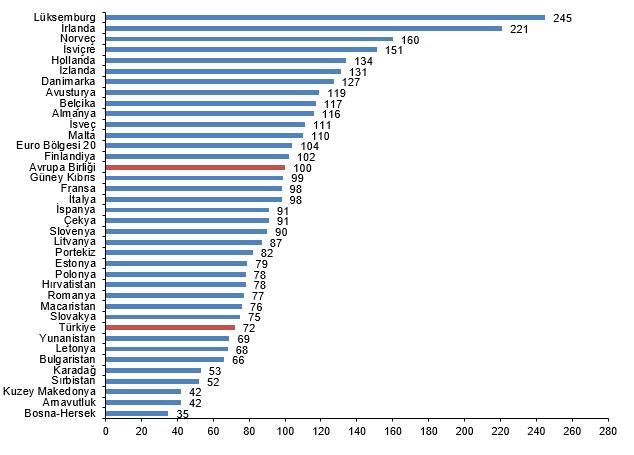 Karşılaştırmalarda yer alan 36 ülke ortasında SGP’ye nazaran kişi başına GSYH endeksi en yüksek ülke 245 ile Lüksemburg, en düşük ülke ise 35 ile Bosna-Hersek oldu. Kişi başına GSYH endeksinde Lüksemburg AB ortalamasının %145 üzerinde, Bosna-Hersek ise %65 altında bedele sahip oldu.