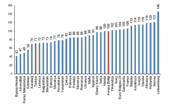 Kişi başına fiili ferdi tüketim düzeyi 27 Avrupa Birliği ülkesi ortalaması 100 iken, Türkiye için 71 oldu ve AB ortalamasının %29 altında kaldı. Karşılaştırmalarda yer alan 36 ülke ortasında kişi başına fiili ferdî tüketim pahası en yüksek ülke 146 ile Lüksemburg, en düşük ülke ise 42 ile Bosna-Hersek oldu.