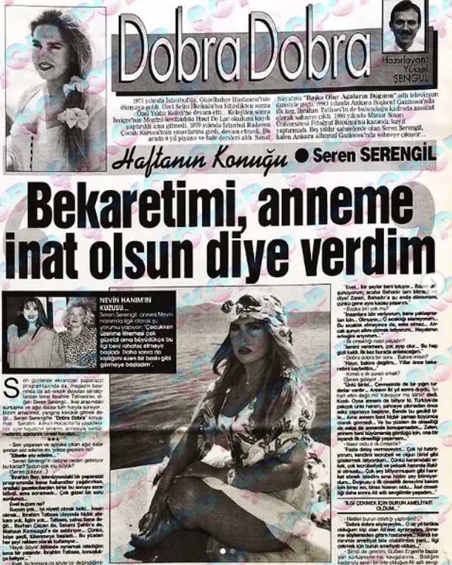 O dönem çıkan haberde Seren Serengil’in “Bakire misin?” sorusuna “Hayır, bakire değilim… Yıllar önce bekaretimi kaybettim… İsmini veremem çok ayıp olur. Ünlü birisi, çevresinde de bir yığın kadınlar vardır. Annem iki yıl sonra duydu ‘İyi halt ettin değil mi! Yakışıyor mu sana?’ dedi, kızdı. Oysa annem de biliyor ki, Türkiye’de pek çok ünlü hanım, sahneye çıkmadan önce seks yapmaya başlıyor. Bende bu gecikti bile… Ama annem beni hiçbir zaman büyümüş olarak görmedi… Ve bu yüzden de cinselliği de seksi de annemle konuşamadım. Zaten beni büyümemiş gördüğü için ona bir isyandı ilk cinselliği yaşamam” cevabını verdiği öne sürülmüştü.
