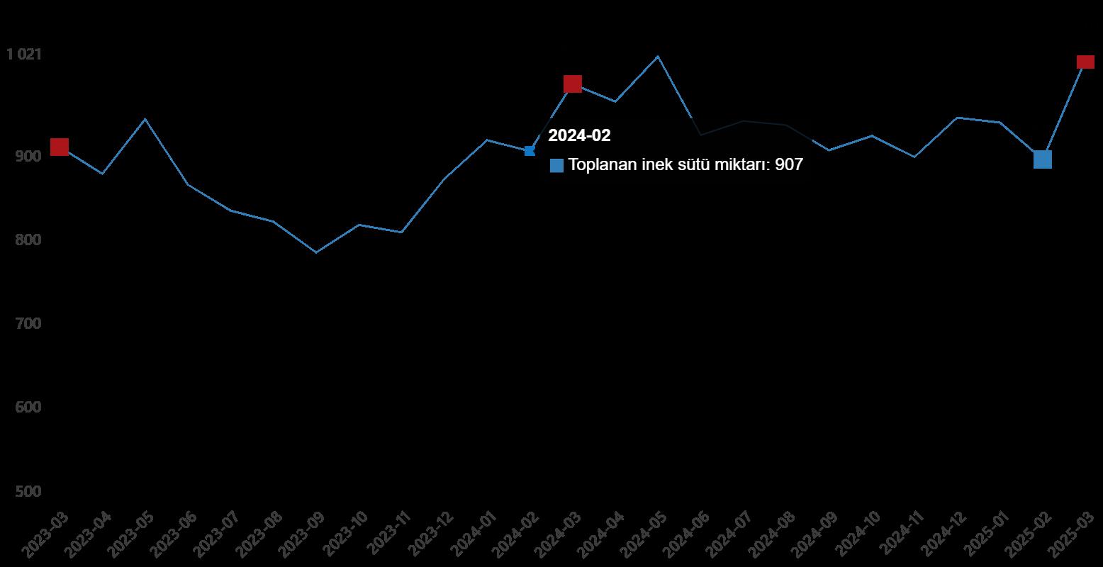 Toplanan inek sütü ve üretilen süt eserleri ölçüsü, Mart 2025
