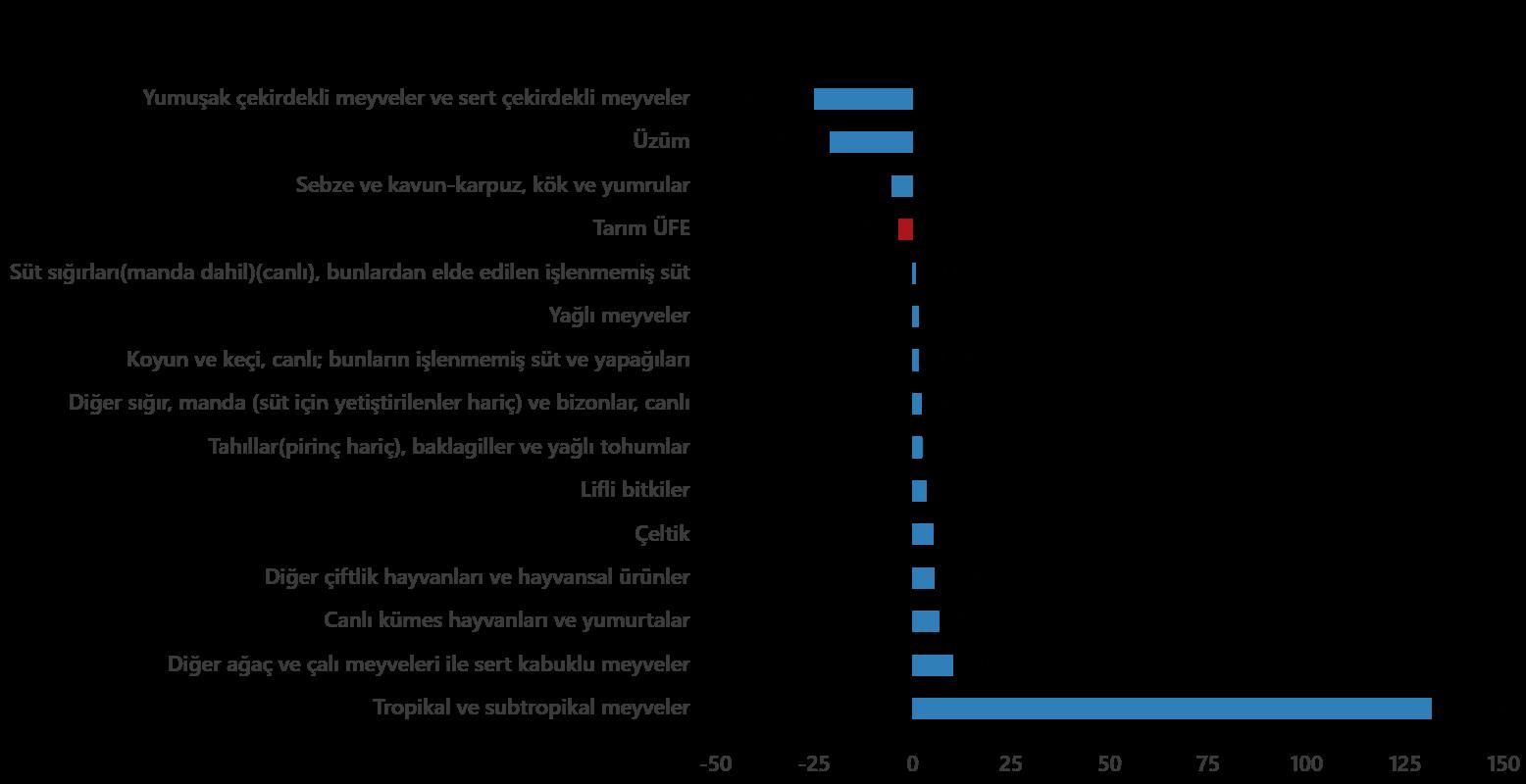 Sektörlerde bir evvelki aya nazaran, tarım ve avcılık eserleri ve ilgili hizmetlerde %3,72 azalış, ormancılık eserleri ve ilgili hizmetlerde %1,50 azalış ve balık ve öteki balıkçılık eserleri; su eserleri; balıkçılık için destekleyici hizmetlerde %2,67 artış gerçekleşti. Ana kümelerde bir evvelki aya nazaran, tek yıllık (uzun ömürlü olmayan) bitkisel eserlerde %0,94 azalış, çok yıllık (uzun ömürlü) bitkisel eserlerde %12,25 azalış ve canlı hayvanlar ve hayvansal eserlerde %1,68 artış gerçekleşti.
