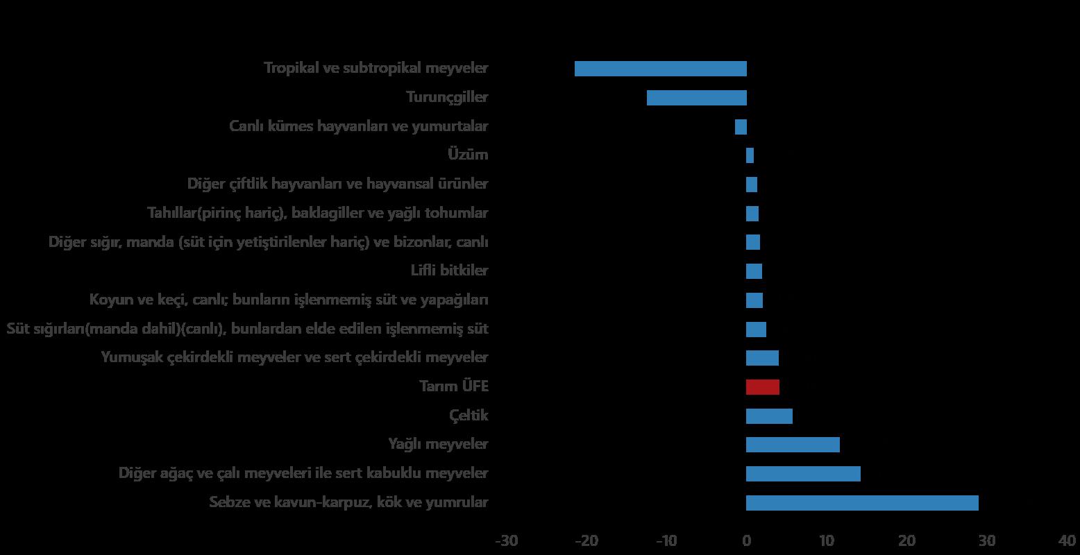 Sektörlerde bir evvelki aya nazaran, tarım ve avcılık eserleri ve ilgili hizmetlerde %4,13 artış, ormancılık eserleri ve ilgili hizmetlerde %2,35 artış ve balık ve öbür balıkçılık eserleri; su eserleri; balıkçılık için destekleyici hizmetlerde %1,84 artış gerçekleşti. Ana kümelerde bir evvelki aya nazaran, tek yıllık (uzun ömürlü olmayan) bitkisel eserlerde %12,00 artış, çok yıllık (uzun ömürlü) bitkisel eserlerde %1,32 azalış ve canlı hayvanlar ve hayvansal eserlerde %1,75 artış gerçekleşti.