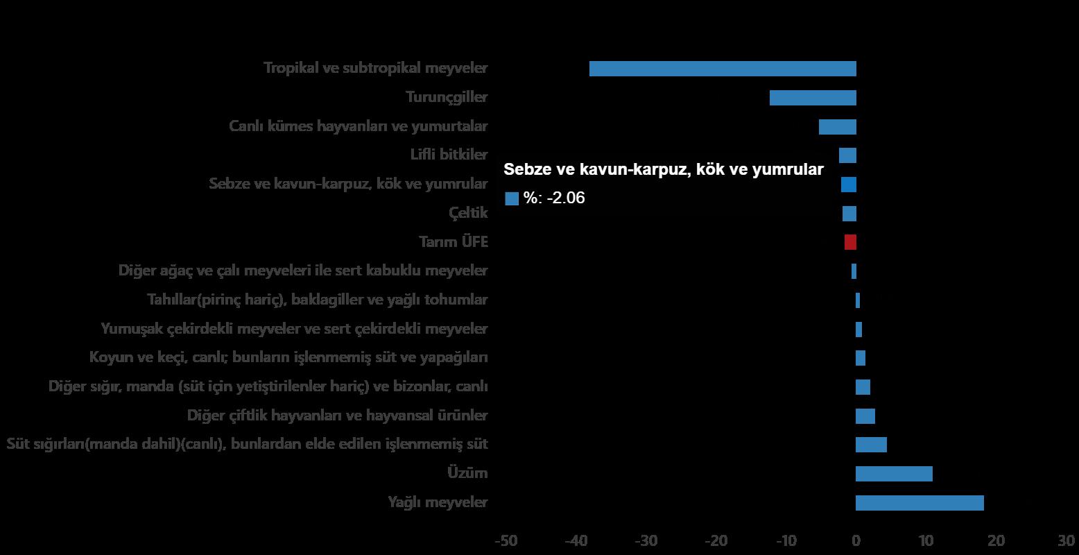 Sektörlerde bir evvelki aya nazaran, tarım ve avcılık eserleri ve ilgili hizmetlerde %1,75 azalış, ormancılık eserleri ve ilgili hizmetlerde %1,66 artış ve balık ve öteki balıkçılık eserleri; su eserleri; balıkçılık için destekleyici hizmetlerde %1,07 artış gerçekleşti. Ana kümelerde bir evvelki aya nazaran, tek yıllık (uzun ömürlü olmayan) bitkisel eserlerde %0,69 azalış, çok yıllık (uzun ömürlü) bitkisel eserlerde %0,03 azalış ve canlı hayvanlar ve hayvansal eserlerde %2,17 artış gerçekleşti.