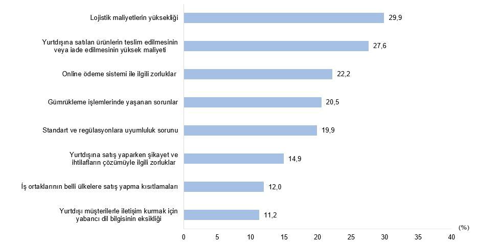 2024 yılında ihracat gerçekleştiren teknogirişimlerin yaşadığı zorlukların başında %29,9 ile lojistik maliyetlerin yüksekliği geldi. Bunu; yurtdışına satılan eserlerin teslim edilmesinin yahut iade edilmesinin yüksek maliyeti (%27,6), online ödeme sistemi ile ilgili zorluklar (%22,2), gümrükleme süreçlerinde yaşanan problemler (%20,5) ve standart ve regülasyonlara uyumluluk sorunu (%19,9) izledi.