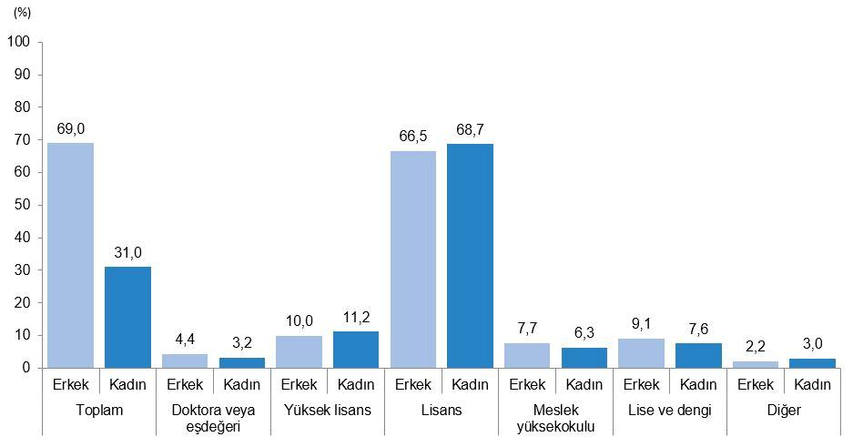 Kadınlarda ise en yüksek hisse lisans mezunlarında (%36,1) olup, bunu doktora yahut muadili (%28,5) ve yüksek lisans (%24,6) takip etmektedir.