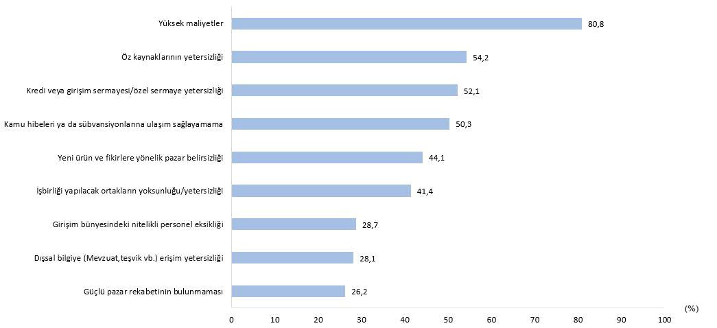 Teknogirişimin kuruluşundan itibaren gerçekleştirdiği faaliyetlerde en değerli engelleyici faktör olarak yüksek maliyetler %80,8 ile birinci sırada yer aldı. Bunu %54,2 ile özkaynakların yetersizliği, %52,1 ile kredi yahut teşebbüs sermayesi/özel sermaye yetersizliği, %50,3 ile kamu hibeleri ya da sübvansiyonlarına ulaşım sağlayamama takip etti.