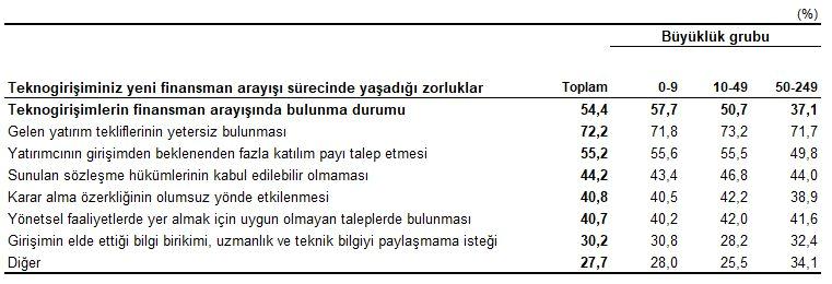 Yeni finansman arayışında bulunan teknogirişimlerin hissesi %54,4 olurken bu teknogirişimlerin %72,2’si gelen yatırım tekliflerini yetersiz buldu. Yeni finansman arayışında bulunan teknogirişimlerin zorluk yaşadığı öbür alanlar; %55,2 ile yatırımcının teşebbüsten beklenenden fazla iştirak hissesi talep etmesi, %44,2 ile sunulan kontrat kararlarının kabul edilebilir olmaması, %40,8 ile karar alma özerkliğinin olumsuz istikamette etkilenmesi oldu.