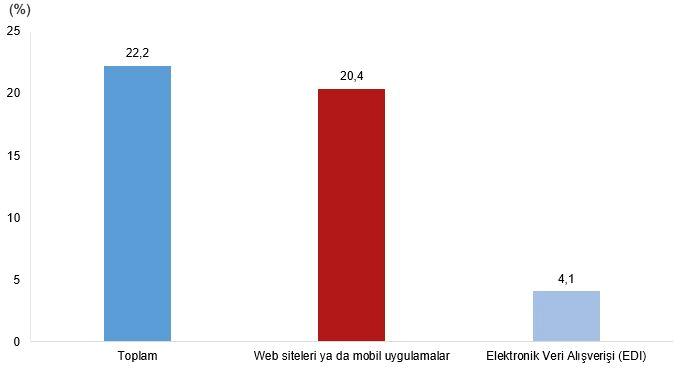 Teknogirişimlerin %22,2’si, 2024 yılında İnternet (web siteleri ya da taşınabilir uygulamalar) ve/veya Elektronik Bilgi Alışverişi (EDI) aracılığı ile e-satış yaptı. Bu teşebbüslerin %20,4’ü web sitesi ya da taşınabilir uygulamalar üzerinden web satış yaptı. Web sitesi ya da taşınabilir uygulamalar üzerinden mal yahut hizmet satışı yapan teknogirişimlerin %88,9’u kendi web siteleri ya da taşınabilir uygulamalarını kullanırken %31,2’si farklı teşebbüslerin de satış yapabildiği çevrimiçi mağazalar ve pazar yerleri ile taşınabilir uygulamalarını kullandı.