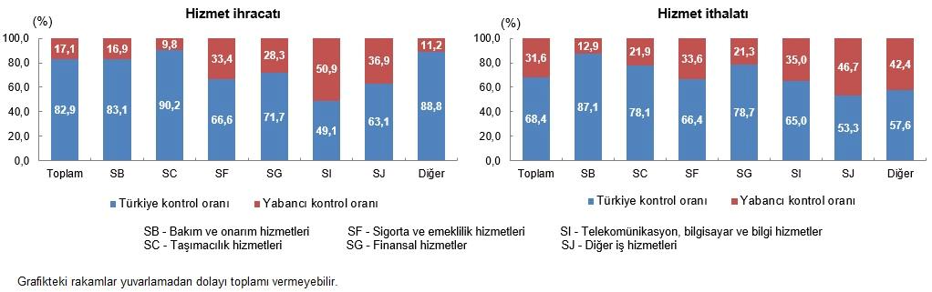 Hizmet ticaretinde en yüksek hisseye sahip olan nakliyecilik hizmetlerinde yapılan ihracatın %90,2’si, ithalatın ise %78,1’i Türkiye denetimindeki teşebbüsler tarafından gerçekleştirildi. Telekomünikasyon, bilgisayar ve bilgi hizmetleri ihracatında Türkiye denetimli teşebbüslerin hissesi %49,1 iken yabancı denetimli teşebbüslerin hissesi %50,9 oldu. Sigorta ve emeklilik hizmetleri ihracatının %33,4’ü ve ithalatının %33,6’sı yabancı denetimli teşebbüsler tarafından yapıldı. Finansal hizmetlerde ihracatın %71,7’sini, ithalatın ise %78,7’sini Türkiye denetimli teşebbüsler gerçekleştirdi.