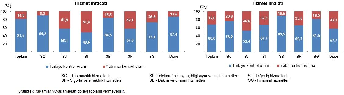 Hizmet ticaretinde en yüksek hisseye sahip olan nakliyat hizmetlerinde yapılan ihracatın %90,2’si, ithalatın ise %76,2’si Türkiye denetimindeki teşebbüsler tarafından gerçekleştirildi. Başka iş hizmetleri ihracatında Türkiye denetimli teşebbüslerin hissesi %58,1 iken yabancı denetimli teşebbüslerin hissesi %41,9 oldu. Telekomünikasyon, bilgisayar ve bilgi hizmetleri ihracatının %51,4’ü ve ithalatının %32,3’ü yabancı denetimli teşebbüsler tarafından yapıldı.