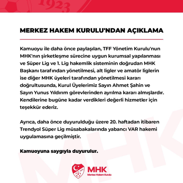 MHK’dan yapılan açıklamada, “Daha önce duyurulduğu üzere 20. haftadan itibaren Trendyol Süper Lig müsabakalarında yabancı VAR hakemi uygulamasına geçilmiştir.” denildi.