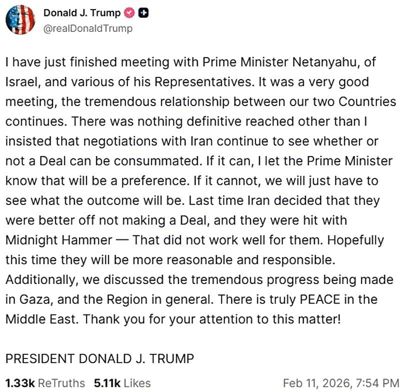 In a subsequent post on his social media site the president called it “a very good meeting” and said that “there was nothing definitive reached, other than I insisted that negotiations with Iran continue to see whether or not a Deal can be consummated.”