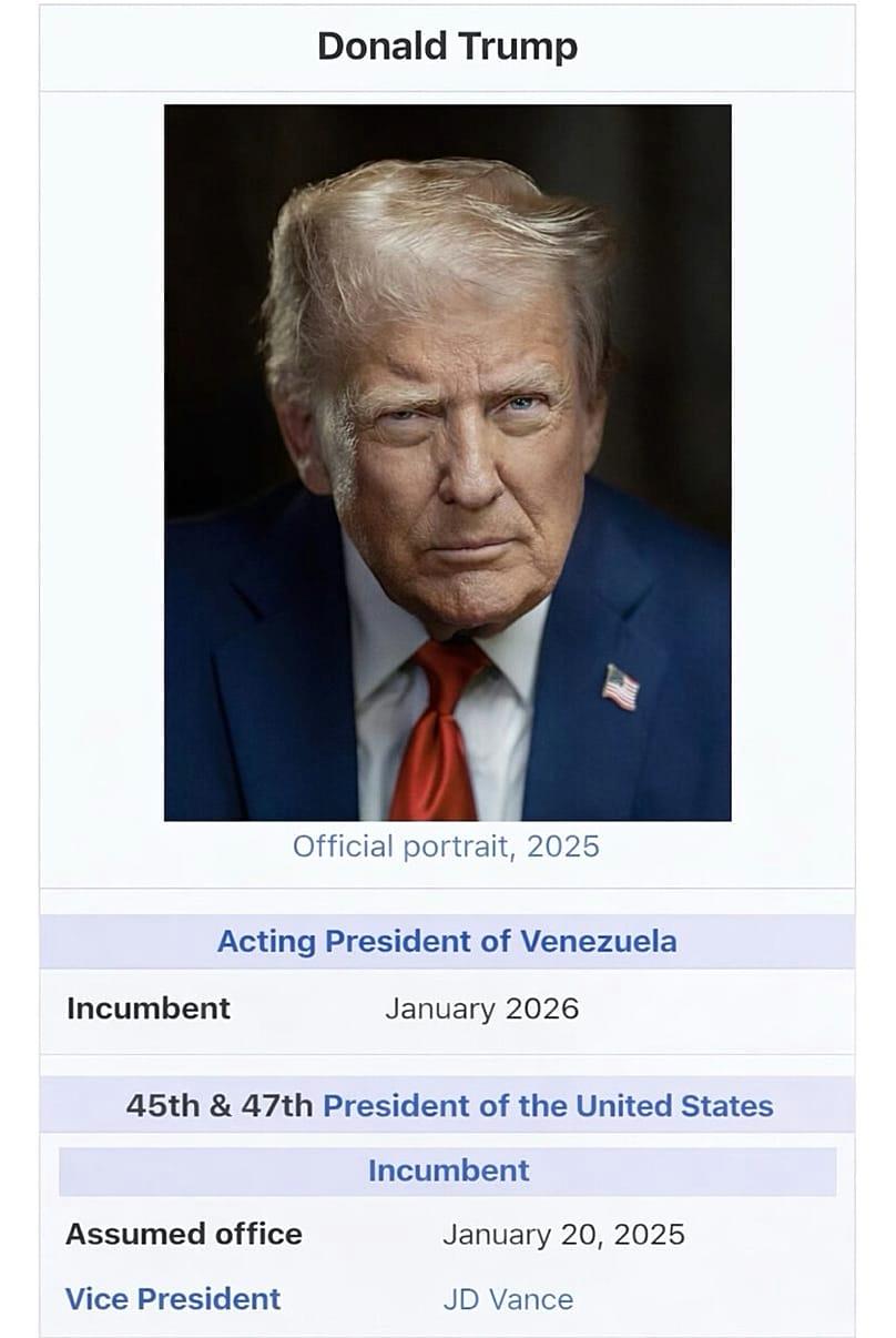 Trump’s actual Wikipedia entry, which uses the same official portrait as his Truth Social post, does not list him as Venezuela’s acting president, listing him only as incumbent president of the United States since January 2025.