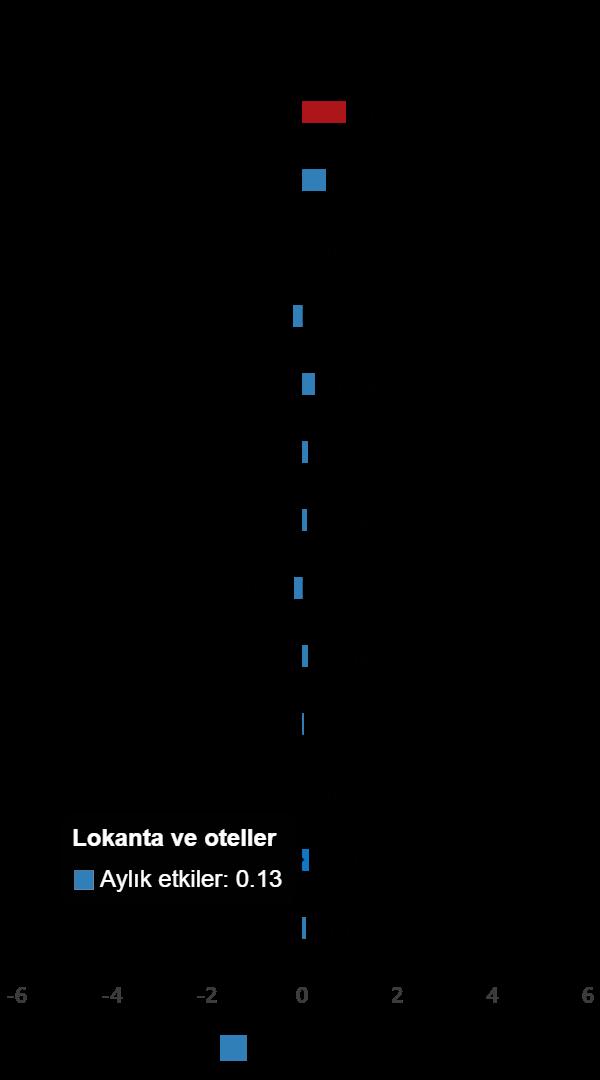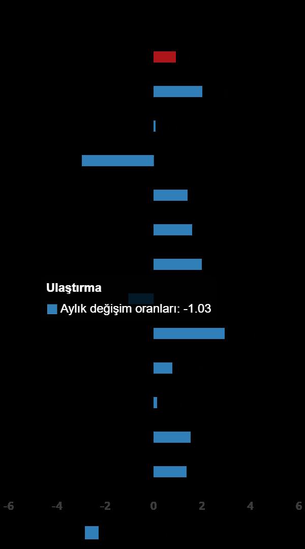 En yüksek tartıya sahip 3 ana harcama kümesinin aylık değişimleri; besin ve alkolsüz içeceklerde %1,99 artış, ulaştırmada %1,03 azalış ve konutta %1,39 artış olarak gerçekleşti. İlgili ana kümelerin aylık değişime olan tesirleri ise besin ve alkolsüz içeceklerde %0,48, ulaştırmada %-0,16 ve konutta %0,24 oldu. (ana harcama kümelerine nazaran endeksler, yükler ve değişim oranları Ek Tablo-1’de, ana harcama kümelerinin genel endeksteki aylık ve yıllık değişime olan tesirleri Ek Tablo-5’tedir).