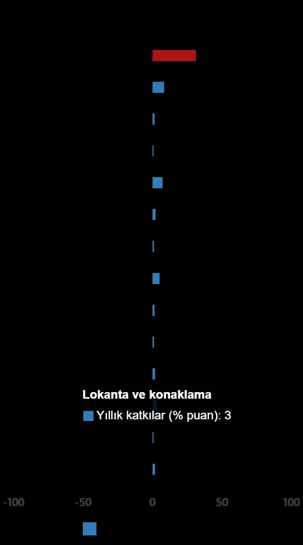En yüksek tartıya sahip üç ana harcama kümesinin yıllık değişimleri; besin ve alkolsüz içeceklerde %31,69 artış, ulaştırmada %29,39 artış ve konut, su, elektrik, gaz ve öbür yakıtlarda %45,36 artış olarak gerçekleşti. İlgili ana harcama kümelerinin yıllık değişime olan katkıları ise besin ve alkolsüz içeceklerde 7,82, ulaştırmada 4,64 ve konut, su, elektrik, gaz ve öbür yakıtlarda 6,74 yüzde puan oldu.