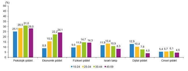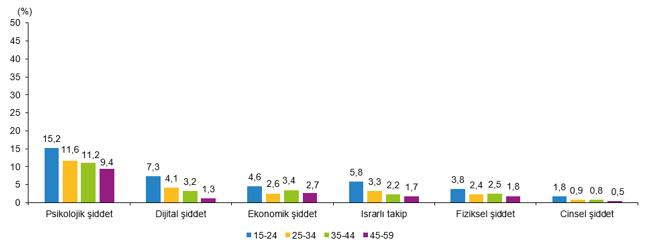 Tüm şiddet tipleri yaş kümesine nazaran incelendiğinde, son 12 ayda en yüksek oranda şiddete 15-24 yaş kümesindeki bayanlar maruz kaldı. Son 12 ayda ruhsal şiddet %15,2 ile en çok 15-24 yaş kümesindeki bayanlarda; en az %9,4 ile 45-59 yaş kümesindeki bayanlarda görüldü.