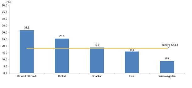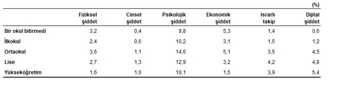 Yaşamının rastgele bir devrinde ekonomik şiddete maruz kalan bayanlar tamamlanan eğitim durumuna nazaran incelendiğinde, bir okul bitirmeyen bayanlar %31,8 ile birinci sırada yer alırken, yükseköğretimi tamamlayan bayanlar ise %8,9 ile son sırada yer aldı.