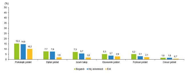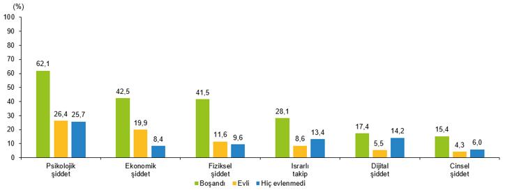 Yaşamının rastgele bir devrinde maruz kalınan şiddet değerlendirildiğinde, boşanan bayanların %62,1’i ruhsal, %42,5’i ekonomik, %41,5’i ise fizikî şiddete maruz kalırken; evli bayanların %26,4’ü ruhsal, %19,9’u ekonomik, %11,6’sı ise fizikî şiddete maruz kaldı. Hiç evlenmeyen bayanların %25,7’si ruhsal şiddete, %14,2’si dijital şiddete, %13,4’ü ise ısrarlı takibe maruz kaldı.