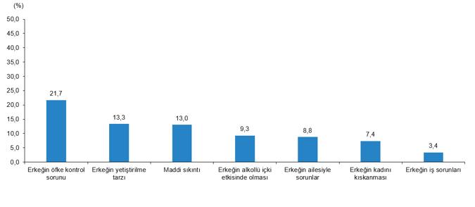 Eşi yahut birlikte olduğu kişinin fizikî ve/veya cinsel şiddetine maruz kalan bayanların belirttiği şiddet nedenleri incelendiğinde, erkeğin öfke denetimi %21,7 ile birinci sırada yer alırken, erkeğin yetiştirilme şekli %13,3 ile ikinci, maddi dert ise %13,0 ile üçüncü sırada yer aldı.