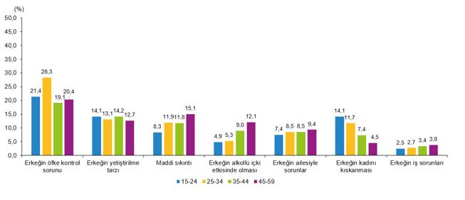 Eşi yahut birlikte olduğu kişinin fizikî ve/veya cinsel şiddetine maruz kalmış bayanların uğradığı şiddet davranışının nedeni olarak erkeğin öfke denetim sorunu olduğunu belirtenlerin %28,3’ünün 25-34 yaş kümesindeki bayanlar olduğu görüldü. Şiddet davranışının nedeni olarak maddi düşünceyi belirtenlerin %15,1’inin 45-59 yaş kümesindeki bayanlar; erkeğin bayanı kıskanmasını belirtenlerin %14,1’inin 15-24 yaş kümesindeki bayanlar olduğu görüldü.
