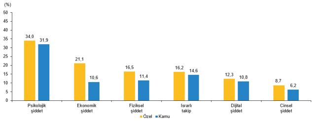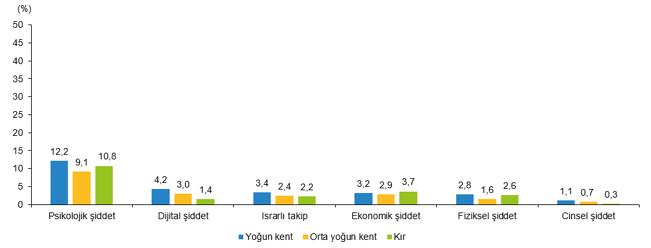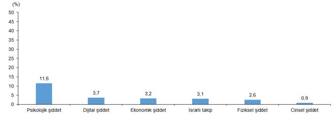 Son 12 ayda bayanların %11,6’sı ruhsal şiddete, %3,7’si dijital şiddete, %3,2’si ekonomik şiddete, %3,1’i ısrarlı takibe, %2,6’sı fizikî şiddete, %0,9’u cinsel şiddete maruz kaldı. Şiddet cinsleri ortasında birinci sırayı ruhsal şiddet alırken ikinci sırayı dijital şiddet aldı.