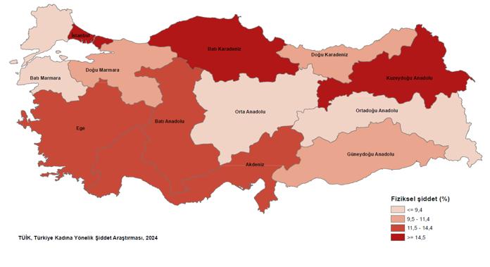 Yaşamının rastgele bir periyodunda fizikî şiddete maruz kalan bayanların oranı İBBS-1 seviyesine nazaran incelendiğinde, fizikî şiddetin en çok görüldüğü bölge %25,9 ile Kuzeydoğu Anadolu Bölgesi iken en düşük olduğu bölge ise %8,8 ile Ortadoğu Anadolu Bölgesi oldu.