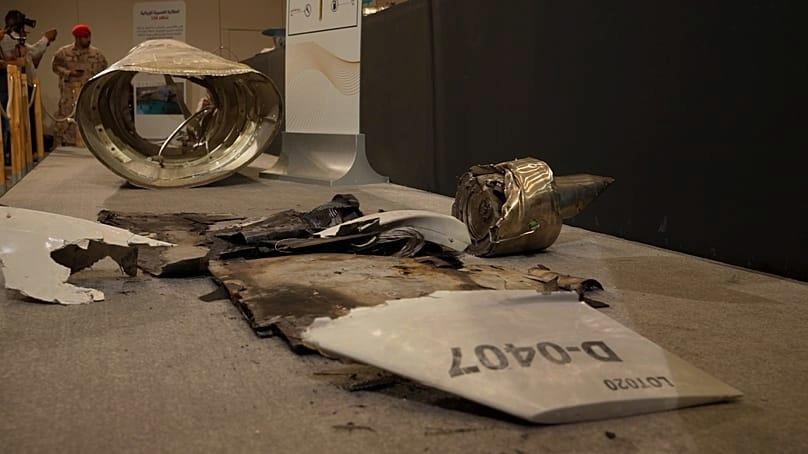 Pieces of recovered missiles and drones debris following Iran’s strikes, ranging from ballistic missiles to suicide drones, were displayed at the government media briefing.
