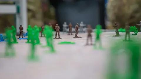 Sasha, a 25-year-old battalion commander, shows me a map. On top he has placed green plastic soldiers to represent where Ukrainian troops are still defending. Brown plastic soldiers show where their enemy has advanced.