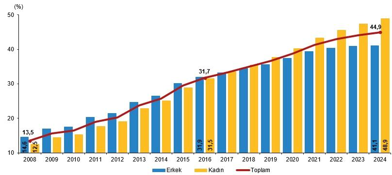 25-34 yaş kümesi nüfusta yükseköğretim mezun oranı 2008 yılında %13,5 iken, 2024 yılında bu oran %44,9 oldu. 2008-2024 yılları ortasında 25-34 yaş kümesindeki nüfusta yer alan bayanlarda yükseköğretim mezun oranı %12,5’ten %48,9’a, erkeklerde ise %14,6’dan %41,1’e yükseldi.