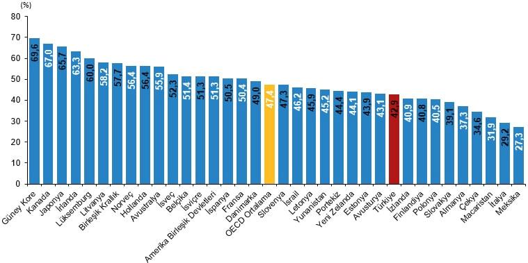 OECD ülkelerine ilişkin en yeni data yılı olan 2022 yılına nazaran, 25-34 yaş ortası nüfusta yükseköğretim mezunlarının oranı incelendiğinde OECD ortalaması %47,4 iken, Türkiye ortalaması %42,9 oldu. OECD ülkeleri ortasında yükseköğretim mezunu oranının en yüksek olduğu ülke %69,6 ile Güney Kore, en düşük olduğu ülke %27,3 ile Meksika oldu.