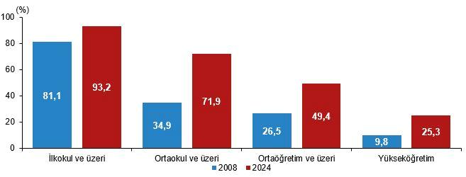 25 yaş ve üzeri nüfusun bitirilen eğitim düzeyine nazaran oranı, 2008, 2024