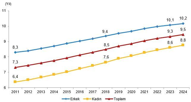 25 yaş ve üzeri nüfusun ortalama eğitim mühleti 2024 yılında 9,5 yıl oldu. 2024 yılında bayanların ortalama eğitim mühleti 8,8 yıl iken, erkeklerin ortalama eğitim mühleti 10,2 yıl oldu.