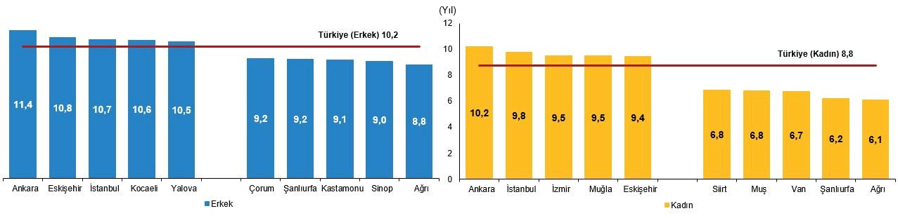 Cinsiyete nazaran ortalama eğitim mühletinin en yüksek ve en düşük olduğu beş vilayet, 2024