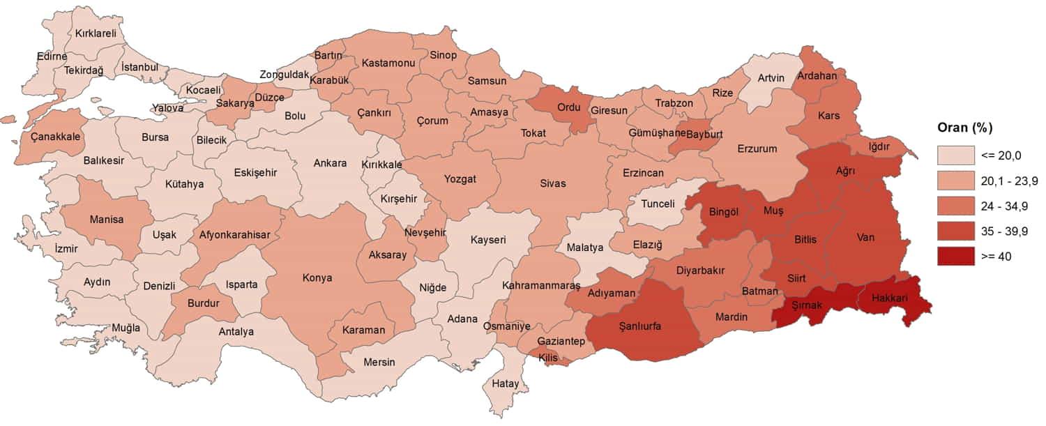 25 yaş ve üzeri nüfusun aldığı ortalama eğitim müddetinin 2015 ile 2024 yılları ortasındaki son on yıllık değişime nazaran en yüksek artış gösterdiği birinci beş vilayet %51,6 ile Şırnak, %42,1 ile Hakkari, %39,9 ile Muş, %38,5 ile Şanlıurfa ve % 37,3 ile Bingöl oldu. En düşük artış gösteren birinci beş vilayet ise %13,7 ile Ankara, %15,4 ile Eskişehir, %15,6 ile Tekirdağ, %15,9 ile İzmir ve İstanbul olarak hesaplandı.