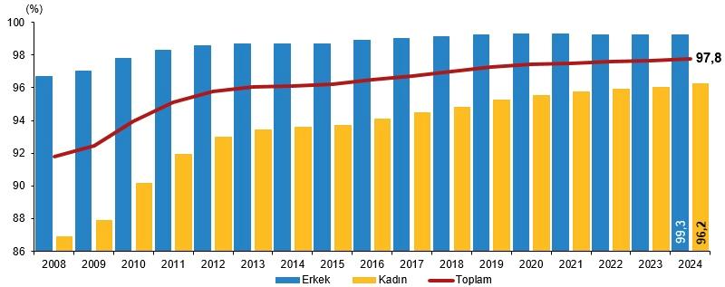 2008 yılında 6 yaş ve üzeri nüfusta okuma yazma bilenlerin oranı %91,8 iken, 2024 yılında bu oran %97,8 olarak hesaplandı. 2008-2024 yılları ortasında bayanlarda okuma yazma bilen oranı %86,9’dan %96,2’ye, erkeklerde ise bu oran %96,7’den %99,3’e yükseldi.