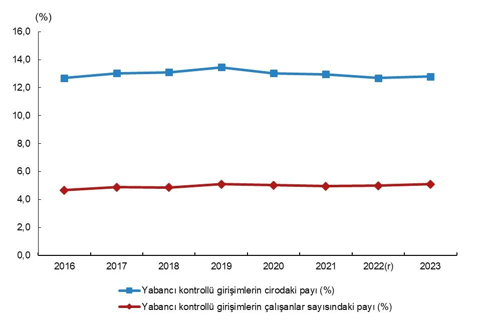 Yabancı denetimli teşebbüs istatistiklerine nazaran yabancı denetimindeki teşebbüs sayısı 2022 yılında 9 bin 287 ve 2023 yılında 10 bin 265 oldu. Bu teşebbüslerin toplam cirodaki hissesi 2022 yılında %12,7, 2023’te ise %12,8 oldu. Yabancı denetimli girişimlerdeki çalışanlar sayısının toplam çalışanlar sayısı içinde hissesi 2022 yılında %5,0, 2023’te ise %5,1 oldu.