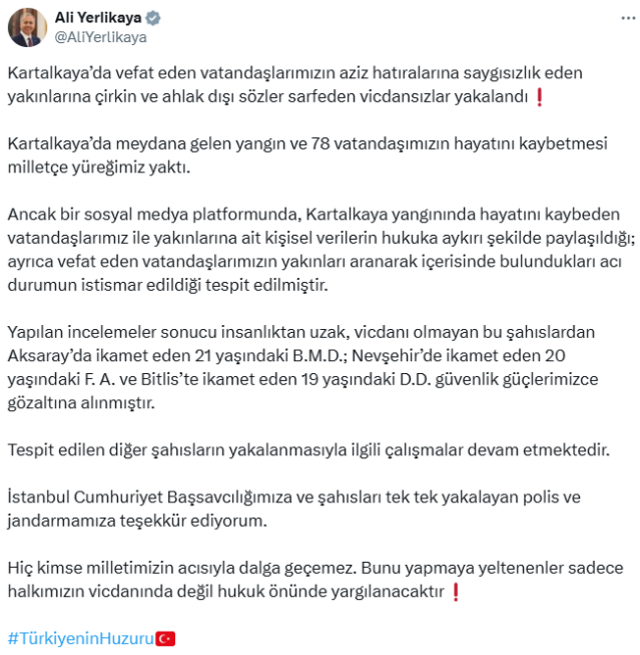 Aksaray’da ikamet eden 21 yaşındaki B.M.D.; Nevşehir’de ikamet eden 20 yaşındaki F. A. ve Bitlis’te ikamet eden 19 yaşındaki D.D.’nin güvenlik güçlerince gözaltına alındığını söyleyen Bakan Yerlikaya, “Kartalkaya’da vefat eden vatandaşlarımızın aziz hatıralarına saygısızlık eden yakınlarıyla çirkin ve ahlak dışı sözler sarfeden vicdansızlar yakalandı.” açıklamasında bulundu.