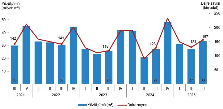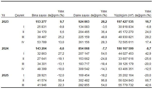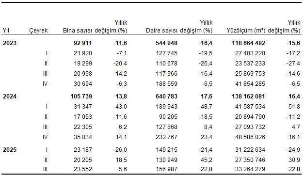 Bir evvelki yılın birebir çeyreğine nazaran, 2025 yılı III. çeyreğinde yapı ruhsatı verilen bina sayısı %22,3, daire sayısı %54,0 ve yüzölçüm %42,6 arttı.