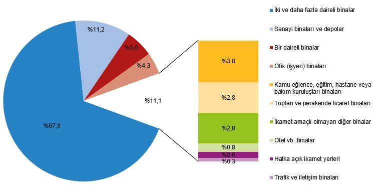 En yüksek yüzölçüm hissesi %67,8 ile iki ve daha fazla daireli binaların oldu