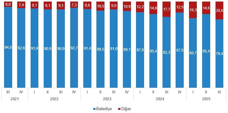 Yapı kullanma müsaade dokümanı verilen yüzölçümde belediye ve başka yetkili yönetimlerin hisseleri (%), III. Çeyrek 2025