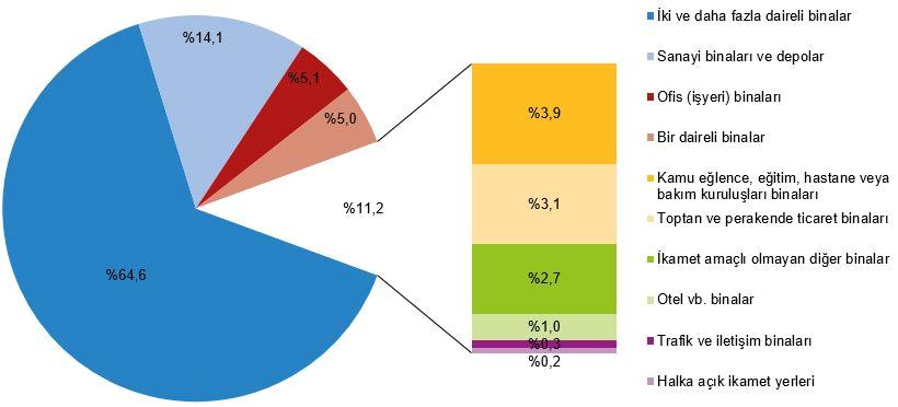 En yüksek yüzölçüm hissesi %64,6 ile iki ve daha fazla daireli binaların oldu
