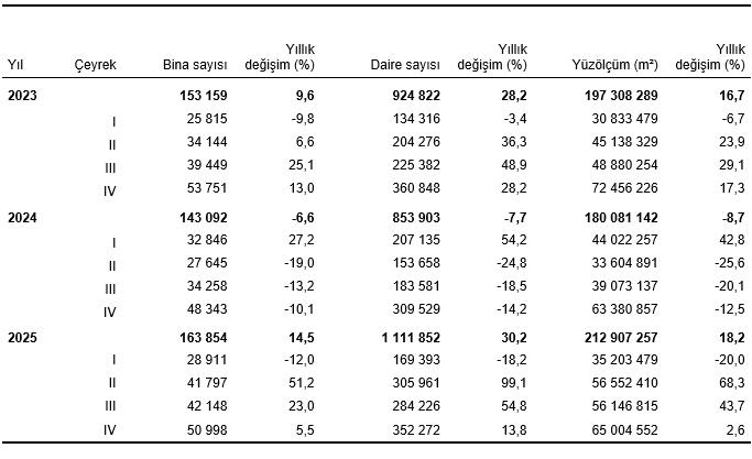 Bir evvelki yılın tıpkı çeyreğine nazaran, 2025 yılı IV. çeyreğinde yapı kullanma müsaade evrakı verilen bina sayısı %0,1 ve yüzölçüm %1,5 azalırken daire sayısı %3,1 arttı.