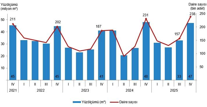 Mevsim ve takvim tesirlerinden arındırılmış serilerde ise, bir evvelki çeyreğe nazaran, 2025 yılı IV. çeyreğinde yapı kullanma müsaade evrakı verilen yüzölçüm %2,1 azalırken bina sayısı %5,6 ve daire sayısı %2,1 arttı.